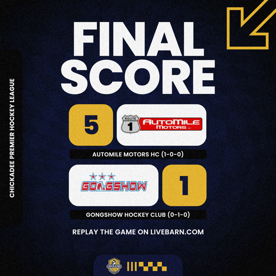 AutoMile Motors jumped out to an early lead and never looked back, skating to a convincing 5–1 win over Gongshow Hockey Club.